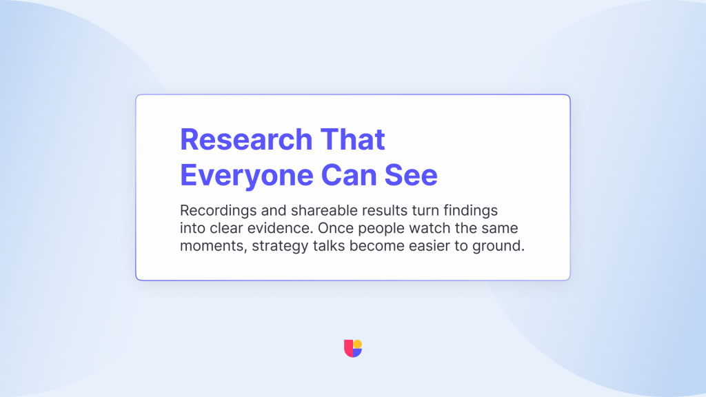 A short highlight reel of participants struggling with a flow can align a room faster than a list of bullet points or “hunches”. A simple snapshot of post test feedback can change how marketing frames a message. When research is shared well, it becomes a common reference point.