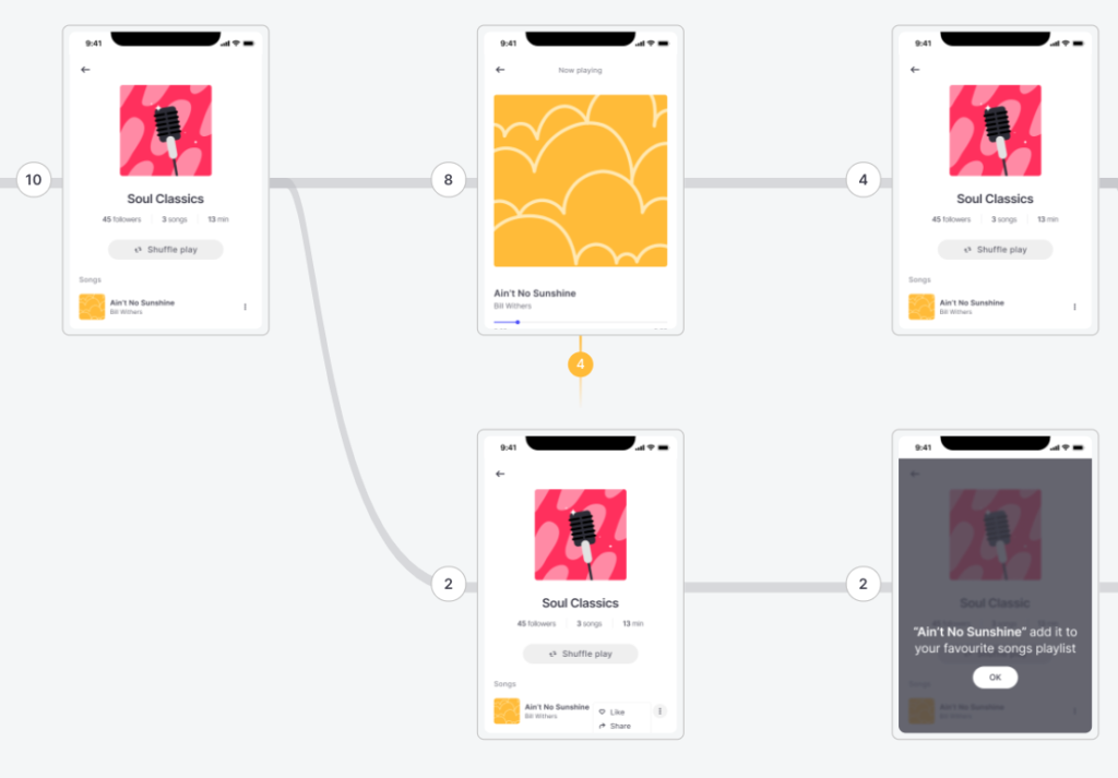 User Flow visualizes the path a user follows from one screen to the next. It helps you understand the behavior of your users, and how they interact with your prototype and create a conversion funnel for it.