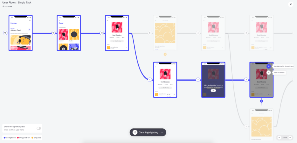 This means that you’ll be able to see if there are any specific screens that made users leave your test/prototype. Once these screens have been recognized and then altered with more appropriate or engaging content, you can go back to the User Flow report to check if the number of drop-offs has declined.