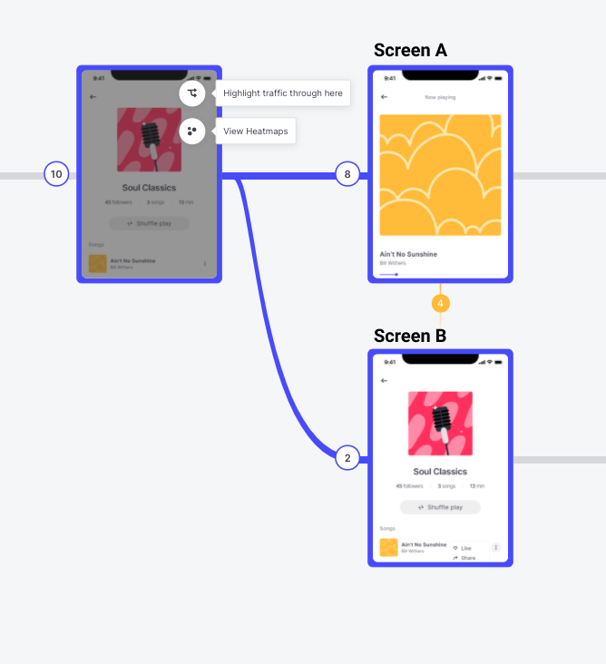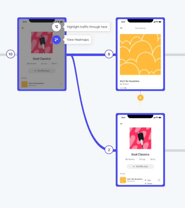 If you want to see the path that users took in order to land on a specific screen on the user-flow, just click the “highlight traffic through here” button!