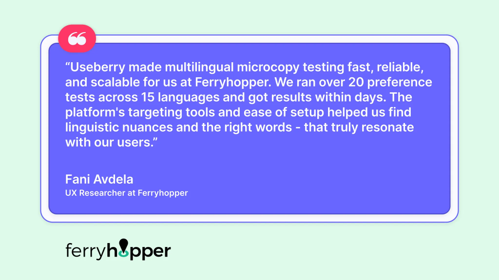 By running around 20 copy tests on Useberry in different languages, Ferryhopper was able to refine and establish an optimized approach for conducting unmoderated microcopy preference tests.