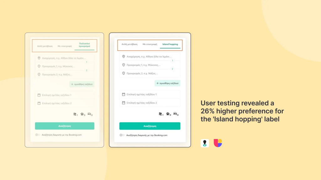 For example, testing the Travel mode tabs revealed subtle differences in how travelers interpreted wording across English, French, and Greek versions. More specifically, in the Greek language, when testing the Travel Mode Tabs texts, they discovered an increased user preference for the new version (the one mentioning “island-hopping”) by 26%, whereas English-speaking users favored the “Multi-destination” version by 55%.