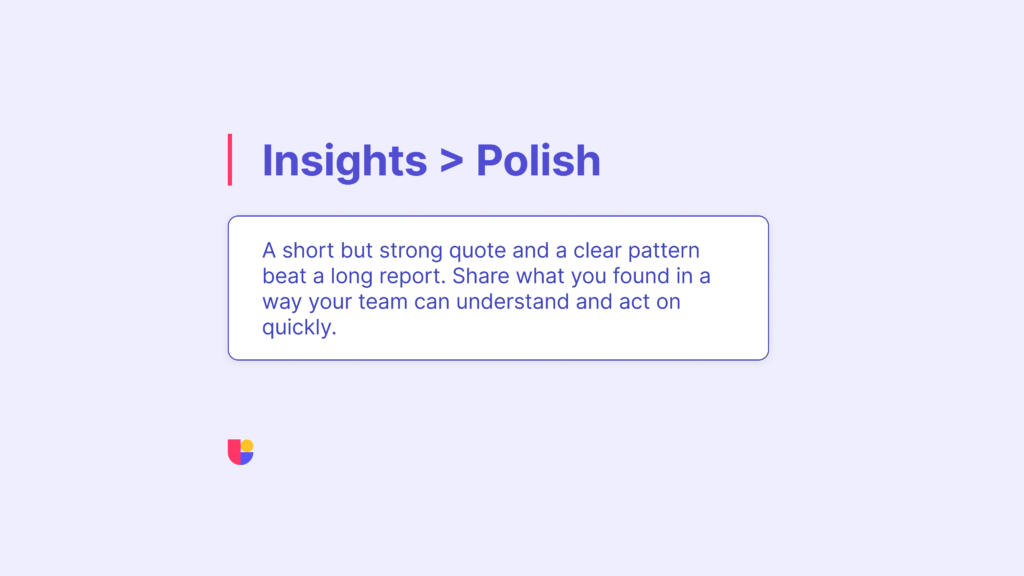 Don’t focus on creating polished deliverables. A single page with three main insights, a few strong quotes, and a short list of suggested changes can be more effective than a long report. What matters is that the findings lead to real improvements.