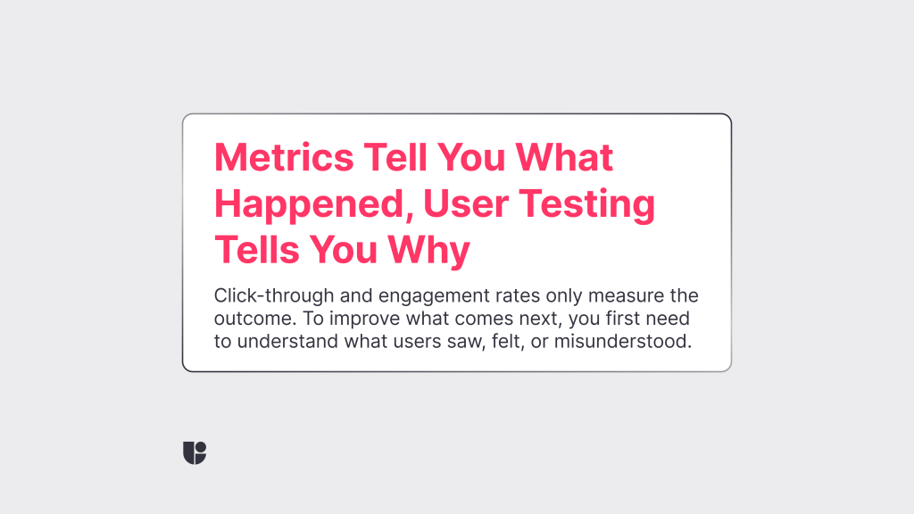 We can spend days inside dashboards and still not know. If we only rely on click rates and retention metrics or engagement KPIs, we are measuring the outcome without understanding the cause. That makes it hard to improve the next campaign with confidence. Which is why we need to make it clear that user testing is not just for UX or product teams. It give you real reactions from real people before your campaign ever goes live.
