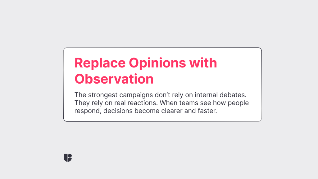 UX teams live by one principle: test early, learn fast. Marketers can do the same instead what usually happens, which is using campaigns themselves as testing grounds. By integrating user testing into creative reviews, you build a loop that goes beyond opinions and guesswork. Designers, copywriters, and marketers start speaking the same language, the language of real user behavior.