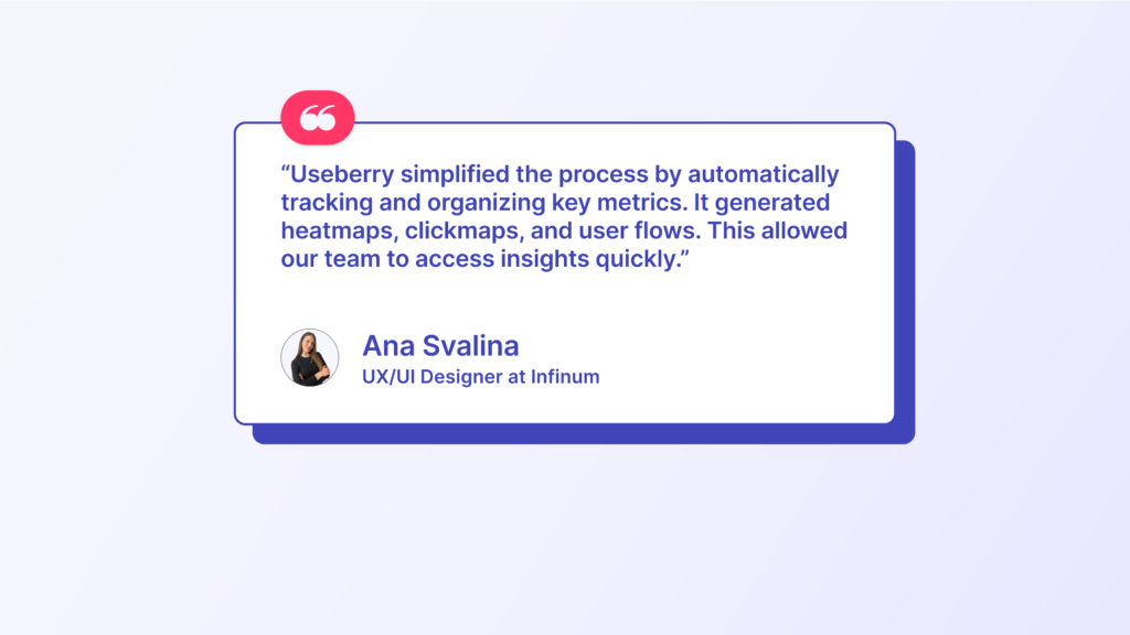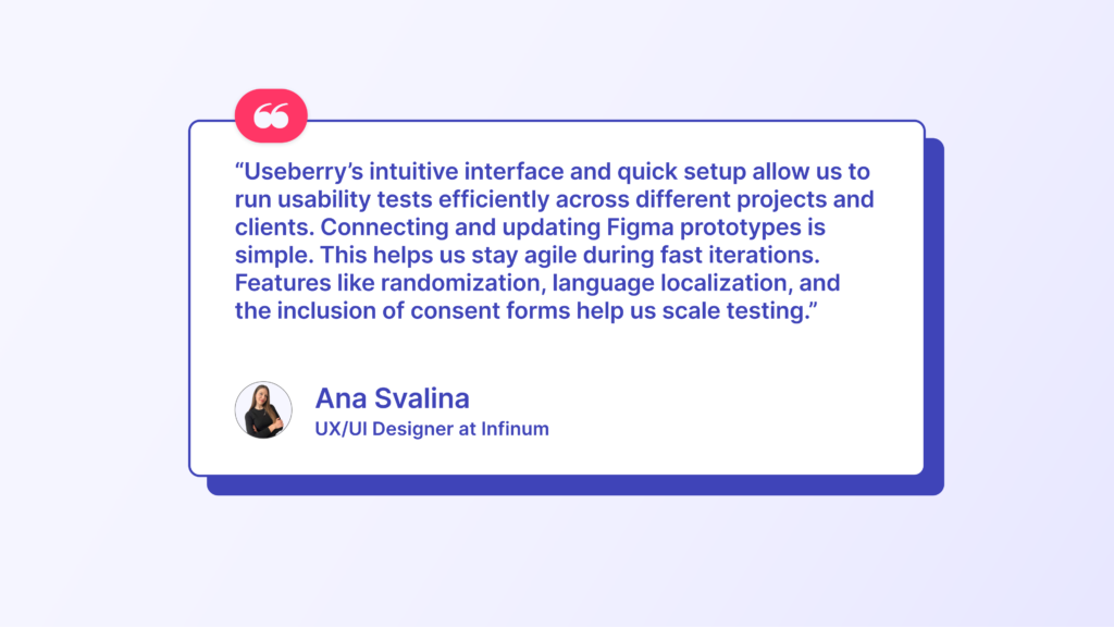 As an agency, Infinum relies on tools that are easy to set up and scale across different projects. Useberry helped reduce prep and analysis time. Real-time results tracking and accessing behavioral data sped up reporting. Creating different test versions within a project was also a huge plus.