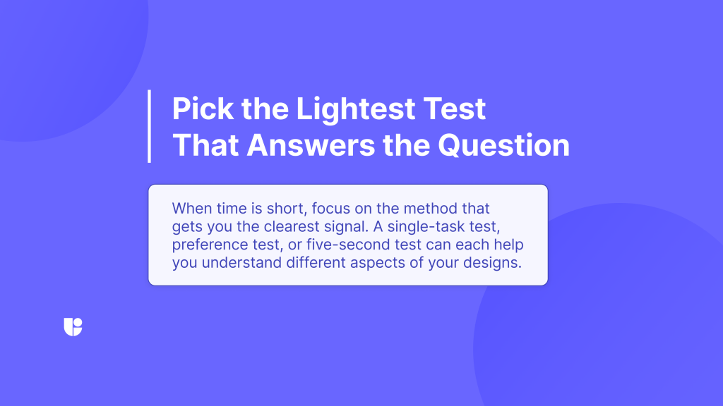 Quick tests fit best before “big decisions” when the direction is still flexible but time is tight. Before a design sprint, run a quick study to validate assumptions or check visual hierarchy. Midway through, use a preference test to confirm that your new design direction feels right. Just before launch, run a short usability test to uncover any last friction points that might affect your user journey. These checkpoints don’t replace full research cycles, but they add speed and confidence to your process. You learn just enough to take your next step with more confidence.