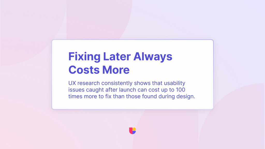 This rework is not a single “cost.” It appears as extra meetings, feature freezes, late-night fixes and delayed roadmaps. The more time you spent going back to “fix” something that wasn’t built on feedback during development, the less time you have for future updates. In fact, the research mentioned above finds that once a product has launched, correcting usability issues can cost 10 to 100 times more than catching them during design.