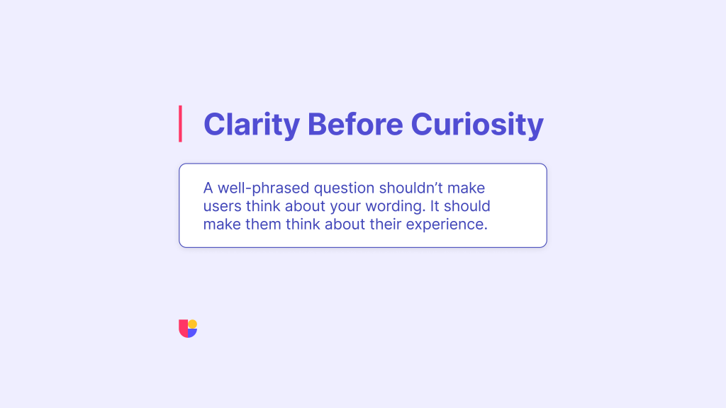 Ask one thing at a time. Something like “Did you find the product helpful and affordable?” mixes two questions into one. If the participant says no, you don’t know which part failed. Keep it clean and specific. One question, one answer. You should try to avoid double-barrel questions as much as possible.