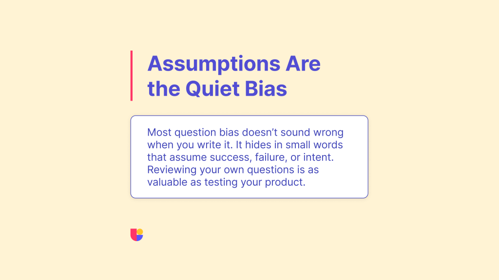 Before launching any study, read your own user testing questions out loud. You will hear where bias or confusion creeps in. Run a small pilot or if you’re working with a team, ask someone outside the project to review your questions. They will catch assumptions that you have stopped noticing.